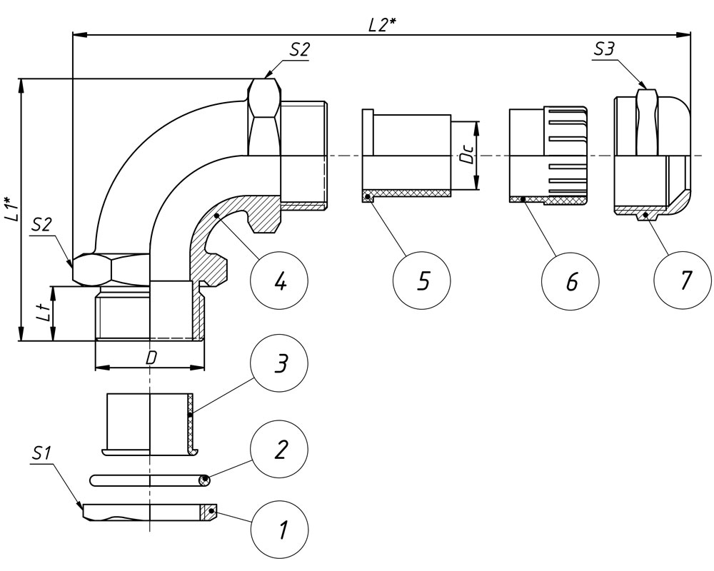 | Артикул | Тип изделия | Типоразмер резьбы D, мм | Диапазон диаметров кабеля Dc, мм | Размер Lt, мм | Размер L1*, мм | Размер L2*, мм | Размер под ключ S1/S2/S3 | Остаток | Цена, ₽ с НДС | Купить |